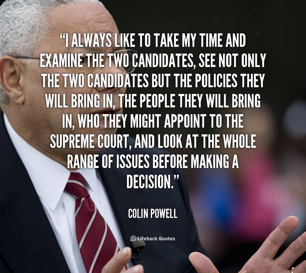 I always like to take my time and examine the two candidates see not only the two candidates but the policies they will bring in the people they will bring in who they might. I have learned from most of the people Ive met and I have tried to inspire the people I have led Powell wrote. I always like to take my time.